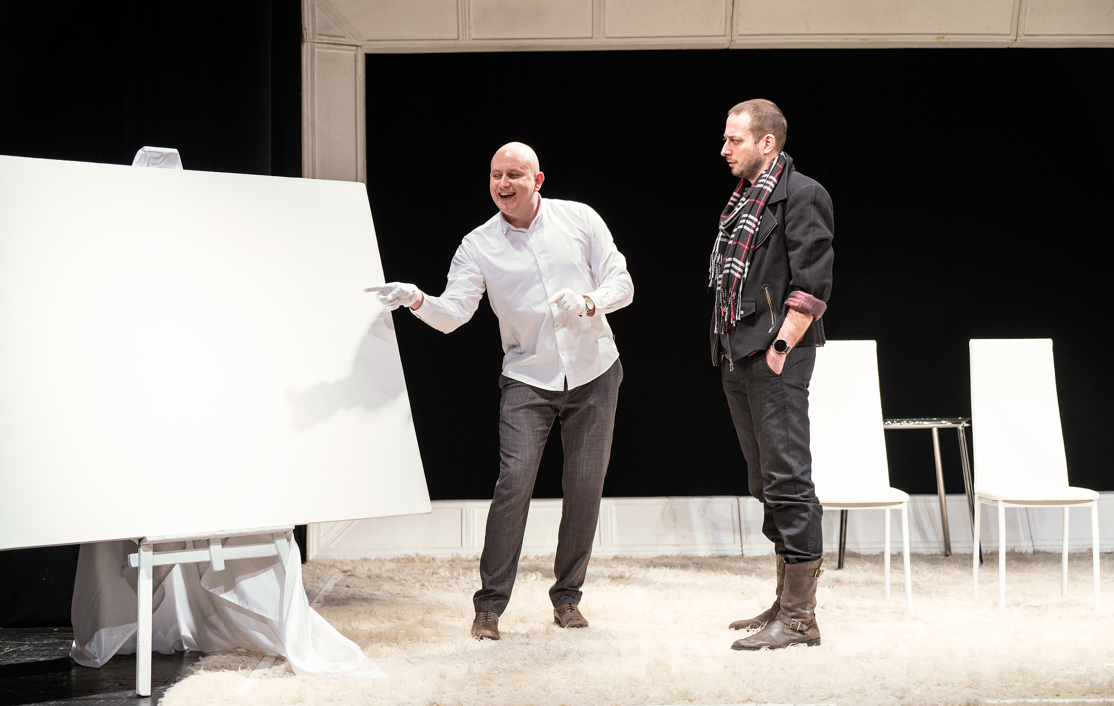 Конфликт в спектакле, как несложно догадаться, разгорается вокруг искусства. Один из закадычных друзей является ярым сторонником классической живописи, второй — страстным поклонником концептуального искусства, третий мечтает о том, чтобы бессмысленные споры наконец-то прекратились, и товарищи-братья вспомнили о его предстоящей свадьбе.